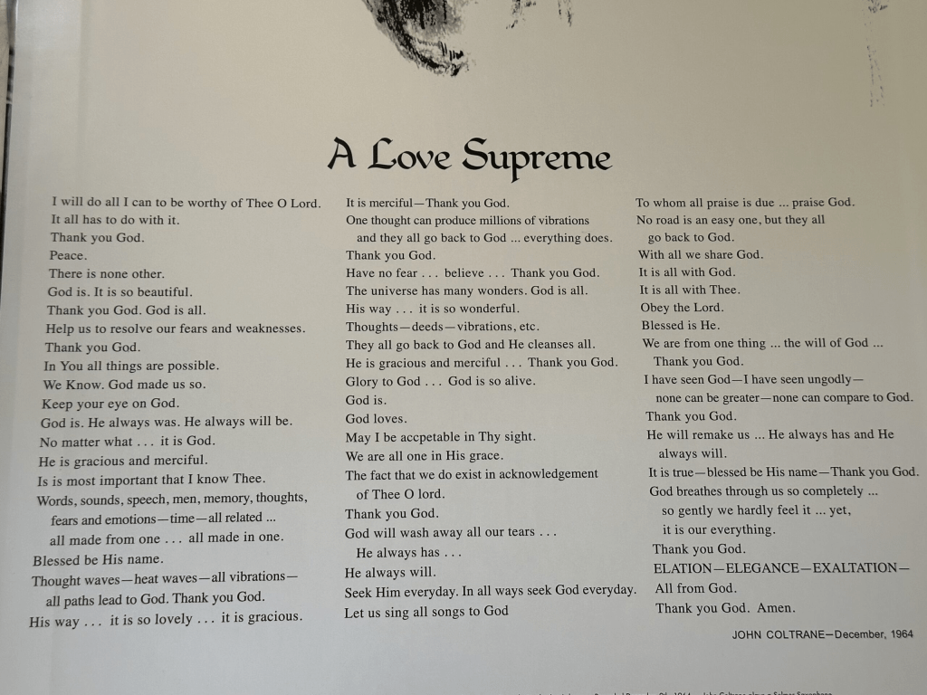 In a brief but powerful statement inside the album, Coltrane wrote that he experienced “a spiritual awakening” in 1957. This awakening led him to gratitude and a life oriented toward God. A Love Supreme was his effort to say thank you.